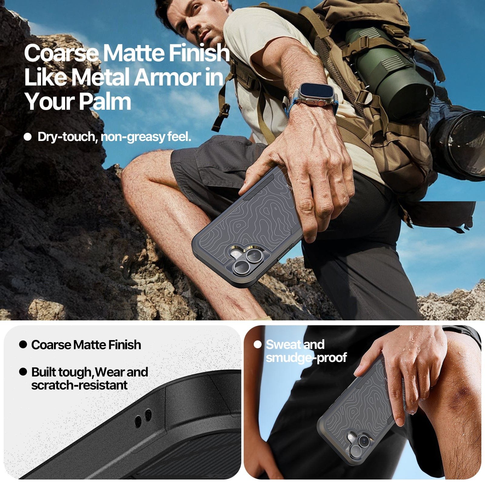 - 【Coarse Matte Texture Grip】Rugged anti-slip matte finish resists fingerprints and sweat for a dry, armored hand feel that’s wear and scratch resistant